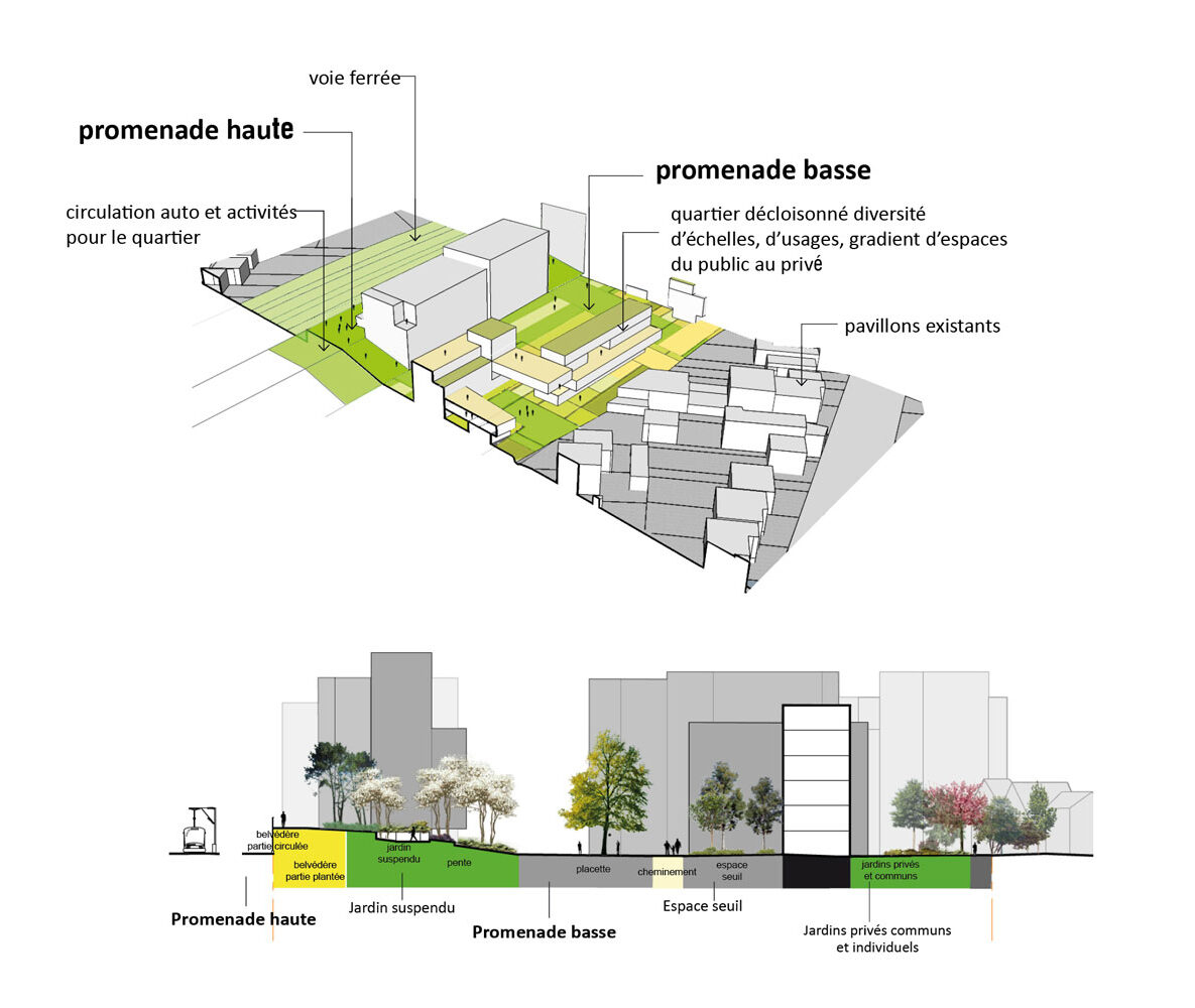 Ancienne friche ferroviaire réhabilitée, l’écoquartier de la Mare Huguet est une ZAC de 3,5 ha à Rosny-sous-Bois, avec une SHON de 4 5000m2 le long des voies ferrées. Paysagiste conseil de l’ensemble des espaces libres, publics et privés de la ZAC, Degré Zéro propose une promenade le long des voies ferrées mettant en exergue des paysages ouverts et lumineux propres à ce genre de sites. Cette promenade ferroviaire est un geste fort, un espace public généreux, qui accroche d’une manière poétique ce futur quartier à la ville et son territoire. Elle s’adresse au grand paysage, constitue un espace public majeur pour le quartier et pour la ville, et sert également de dispositif antibruit. Ce travail a été présenté par Sabrina HIRIDJEE au forum des projets urbains en novembre 2010.
