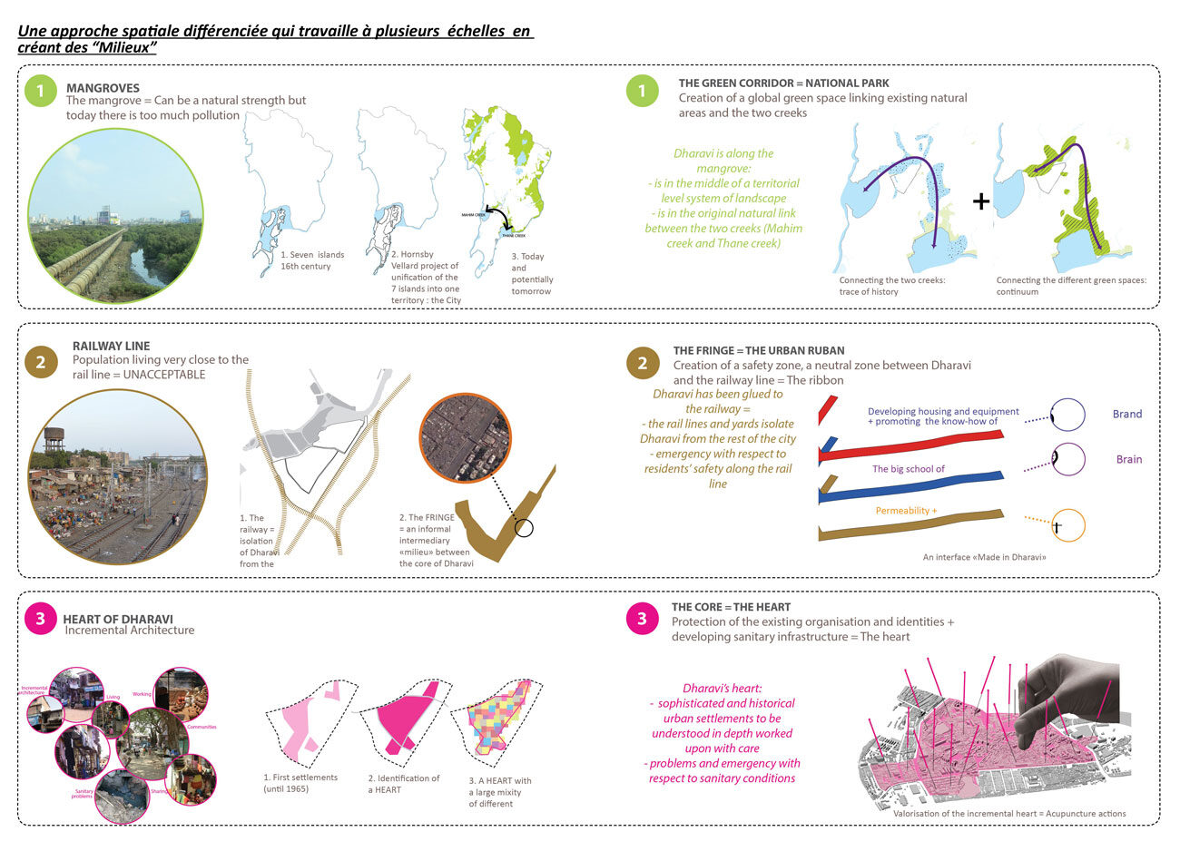 Maitrise d’ouvrage : Urban Design Research Institute Localisation : Dharavi, Mumbai (Inde) Rôle de l’agence: mandataire (urbanisme et territoire) Partenaires : OGI bet VRD, RR&A mobilités, Atelier ANONYME architectes, 3x3 Design participatif, 3ème Paysage, Chris Younès, philosophe (GERPHAU), Odette LOUISET, géographe, Giovanni BROUSSARD économiste (ONU), Yask Desai (photographie), KOMET films Coût de l’opération : NC Superficie : 250 Ha Calendrier : Concours International, lauréat (2015)