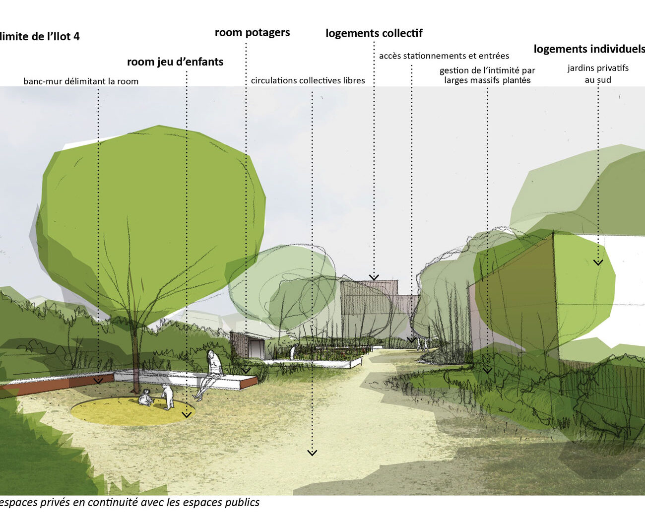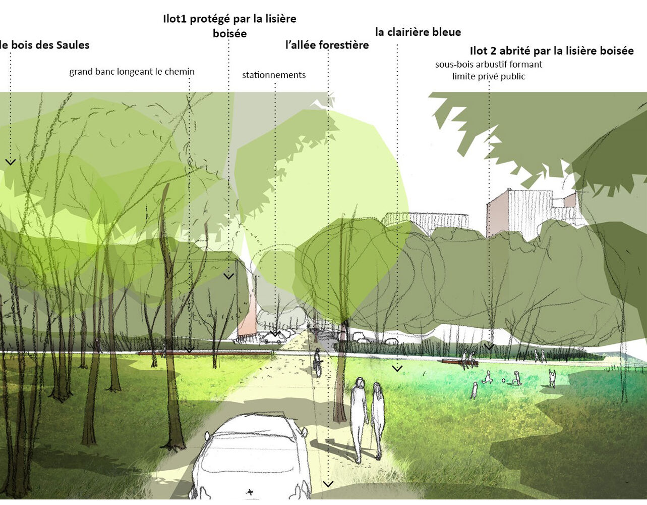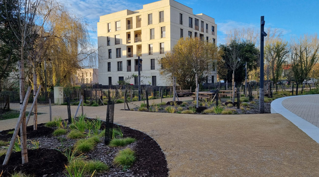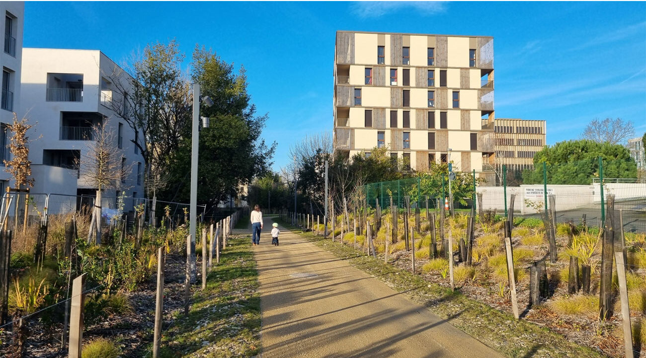 Le projet s’inscrit dans le cadre de la démarche ambitieuse lancée par Bordeaux Métropole de développer 50 000 logements autour des axes de transports collectifs. Dans les notes d’orientation du programme, Degré Zéro a identifié les grands objectifs sur lesquels nous appuyer. Notre approche est triple. Celle d’un quartier où l’on trouve un équilibre entre espaces bâtis et espaces naturels, et où la nature est lisible ; celle d’un lieu où l’on donne à voir toutes les échelles, implanté avec bienveillance, sans abîmer le site ; enfin, celle d’un lieu où le non-bâti n’est pas une résultante du bâti.