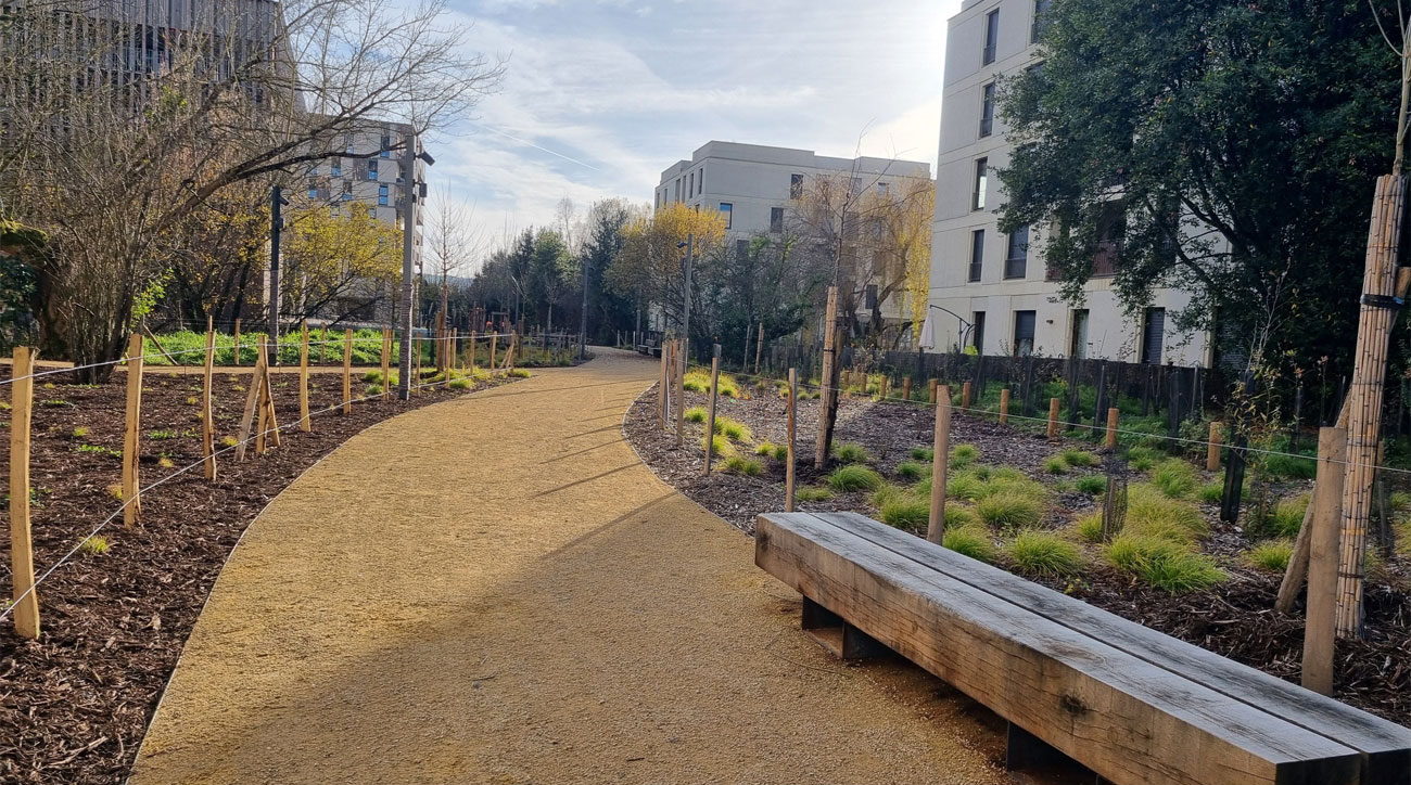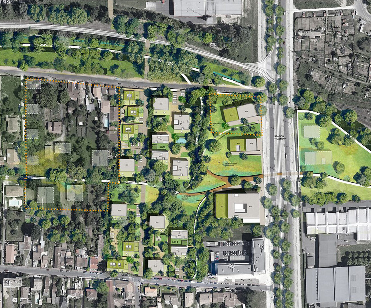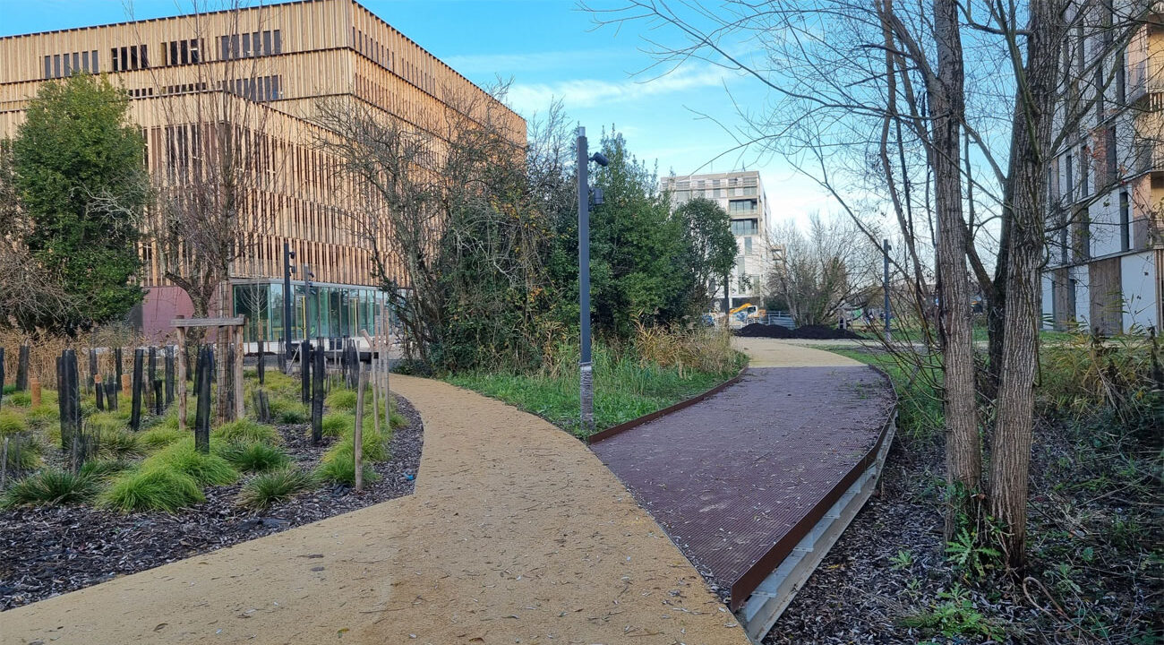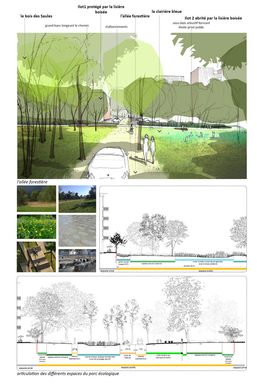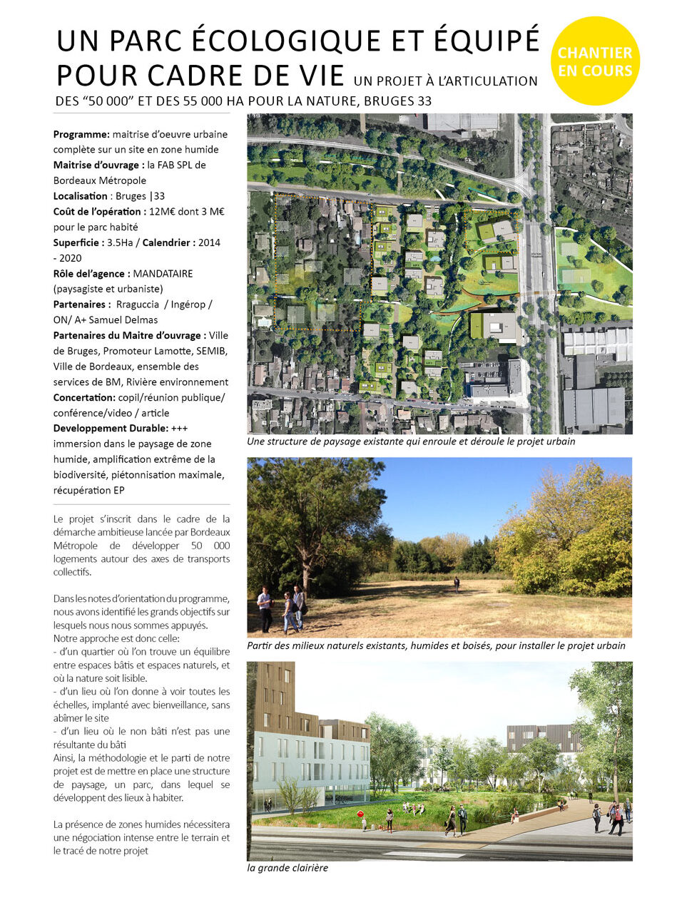 Programme : maitrise d’œuvre urbaine complète sur un site en zone humide Maitrise d’ouvrage : FAB SPL de Bordeaux Métropole Localisation : Bruges (33) Coût de l’opération : 12 M€ dont 3 M€ pour le parc habité Superficie : 3,5 Ha Calendrier : 2014 – 2020 Rôle de l’agence : mandataire (paysagiste et urbaniste) Partenaires : Raguccia, Ingérop, ON, A+ Samuel Delmas Partenaires du maitre d’ouvrage : ville de Bruges, Promoteur Lamotte, SEMIB, Ville de Bordeaux, ensemble des services de BM, Rivière environnement Concertation : copil, réunion publique, conférence, vidéo, article Développement durable : immersion dans le paysage de zone humide, amplification extrême de la biodiversité, piétonisation maximale, récupération EP