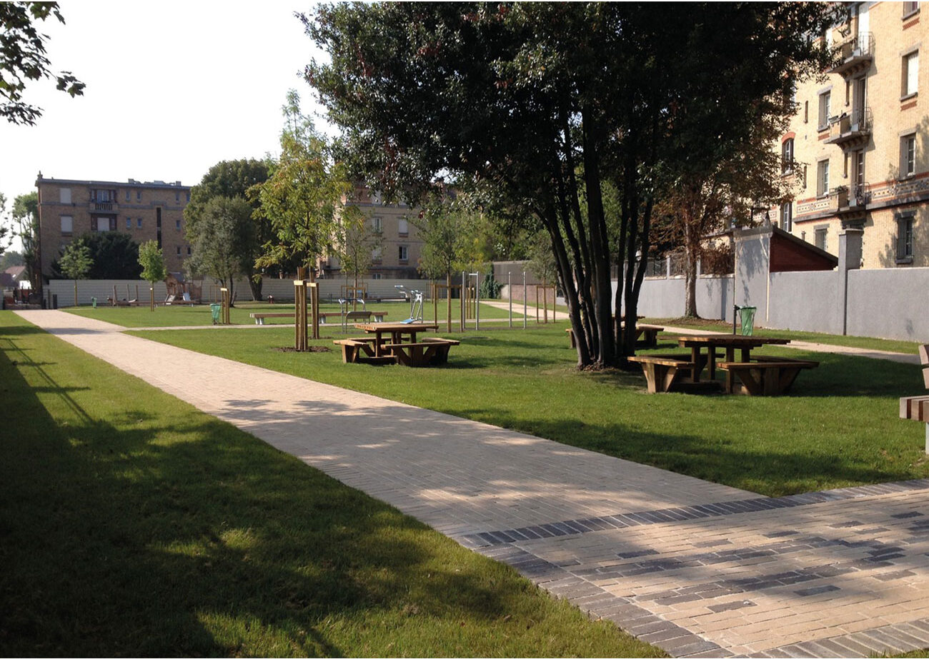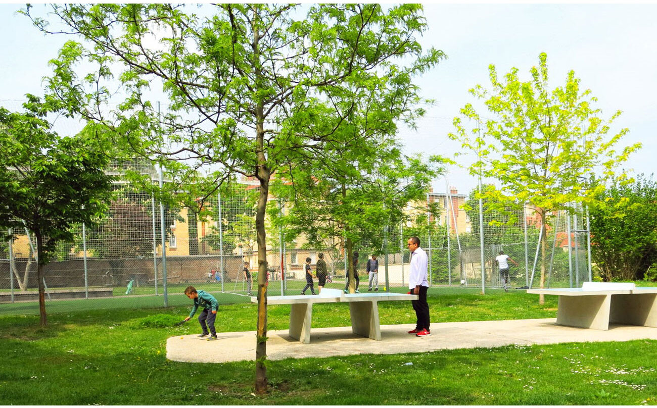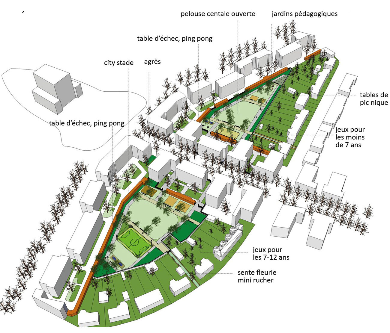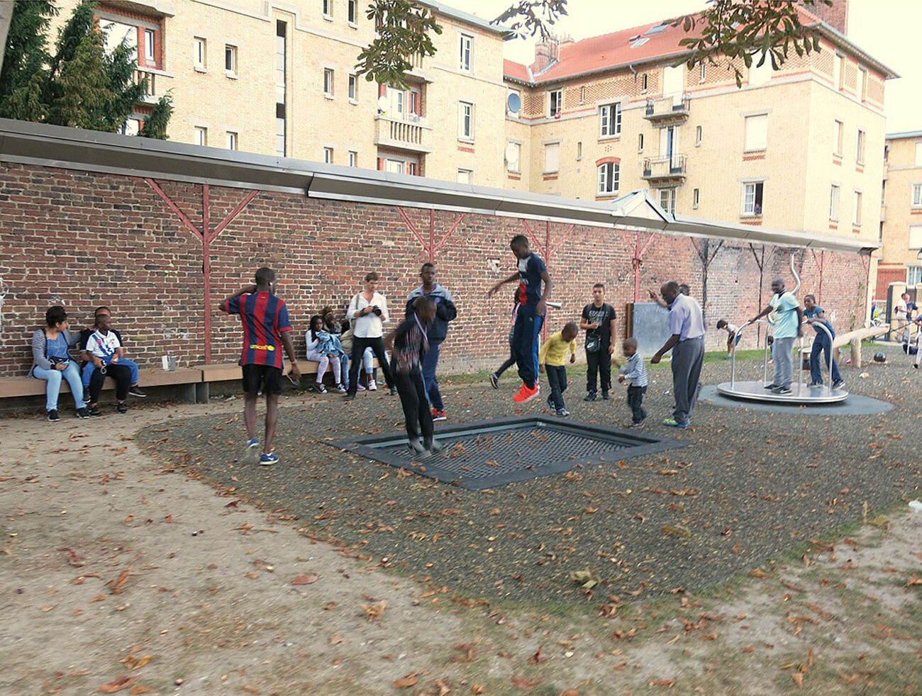 Ici, il a été question, pour Degré Zéro, de ne pas céder à l’injonction de faire un projet type « renouvellement urbain » ou un équipement « social » pour un public en difficulté. Même si les problématique ANRU ont été totalement intégrées au projet, notre réponse conceptuelle affirme une continuité historique et une prise de conscience de la valeur patrimoniale de la Cité Jardin. Le travail original au sol mettant en lien les façades historiques des bâtiments classés et les cœurs d’îlots, en est un exemple. Le site a, en même temps, été pensé pour l’accueil d’un public adolescent, avec une série d’équipements qui leur sont adaptés (city stade, agrès, tennis de table). L’ensemble de ces équipements ont été insérés dans le système conceptuel et spatial qui a pour objectif de se fondre dans le système urbain existant.