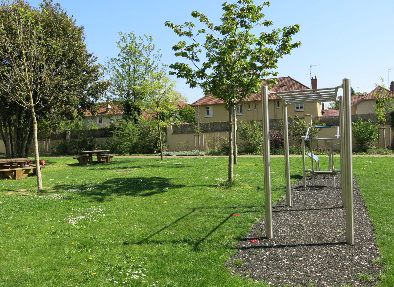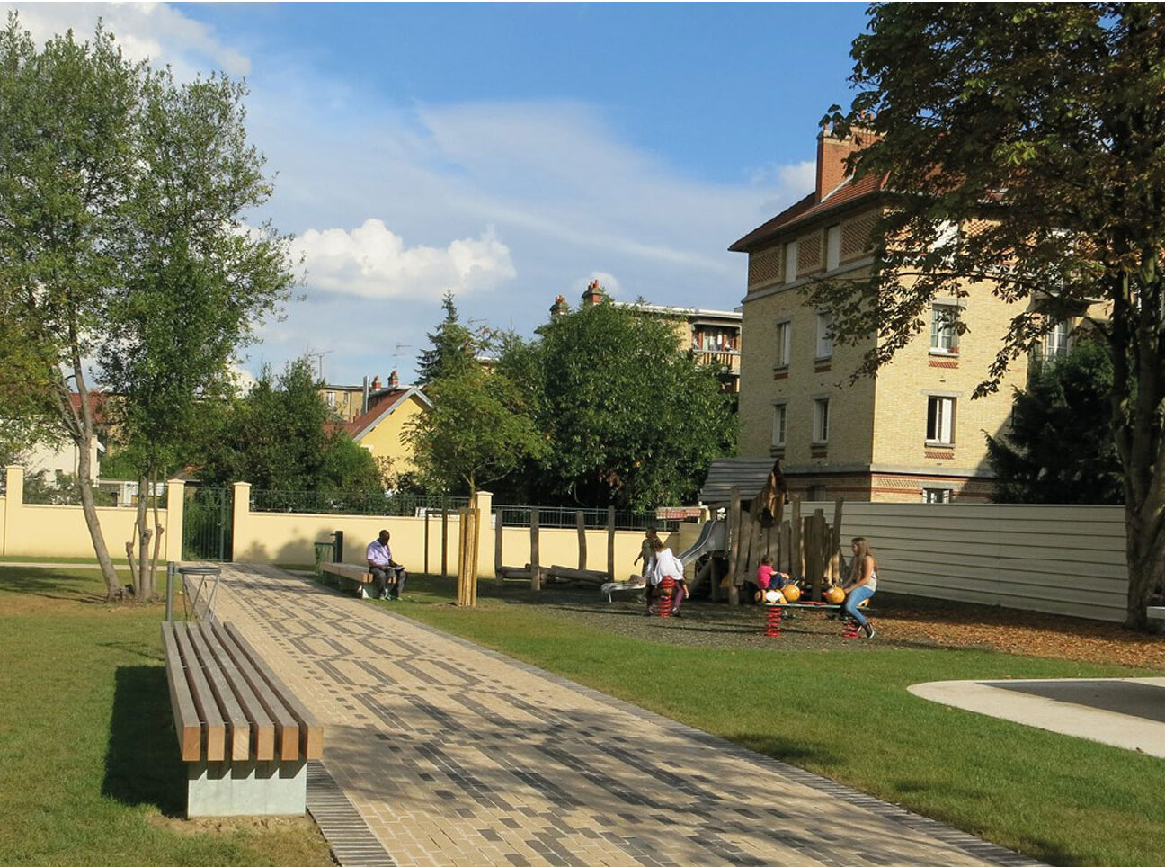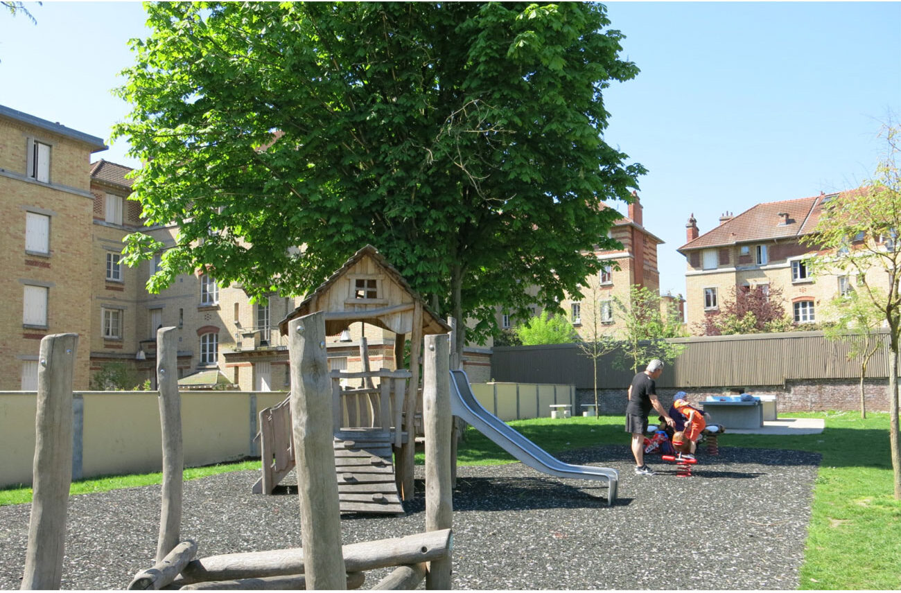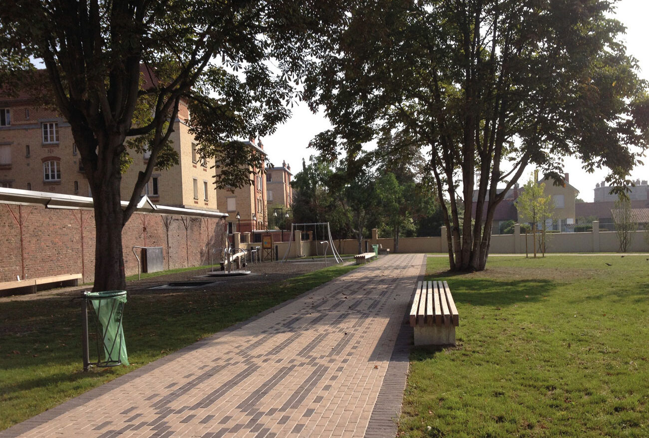 Ici, il a été question, pour Degré Zéro, de ne pas céder à l’injonction de faire un projet type « renouvellement urbain » ou un équipement « social » pour un public en difficulté. Même si les problématique ANRU ont été totalement intégrées au projet, notre réponse conceptuelle affirme une continuité historique et une prise de conscience de la valeur patrimoniale de la Cité Jardin. Le travail original au sol mettant en lien les façades historiques des bâtiments classés et les cœurs d’îlots, en est un exemple. Le site a, en même temps, été pensé pour l’accueil d’un public adolescent, avec une série d’équipements qui leur sont adaptés (city stade, agrès, tennis de table). L’ensemble de ces équipements ont été insérés dans le système conceptuel et spatial qui a pour objectif de se fondre dans le système urbain existant.
