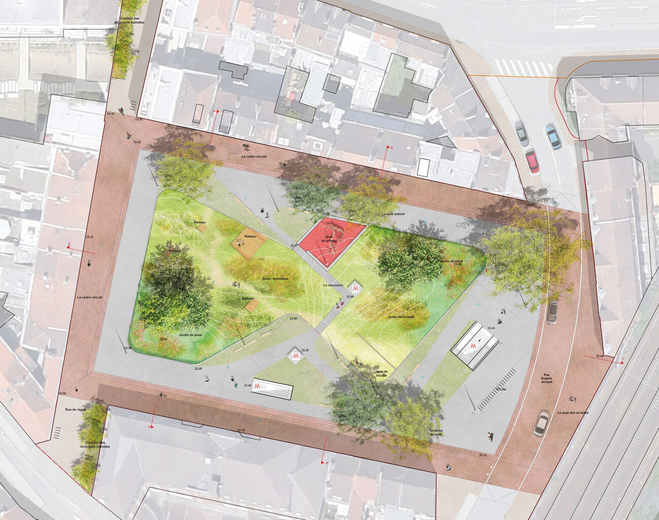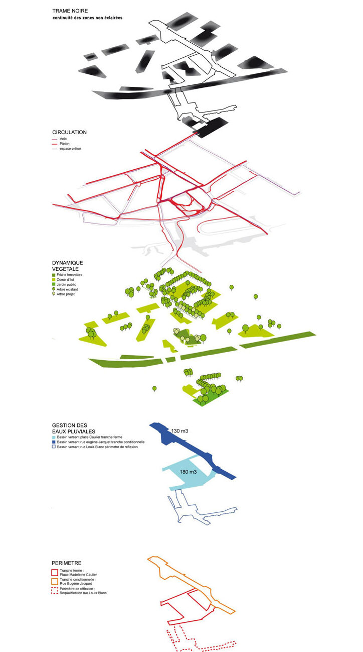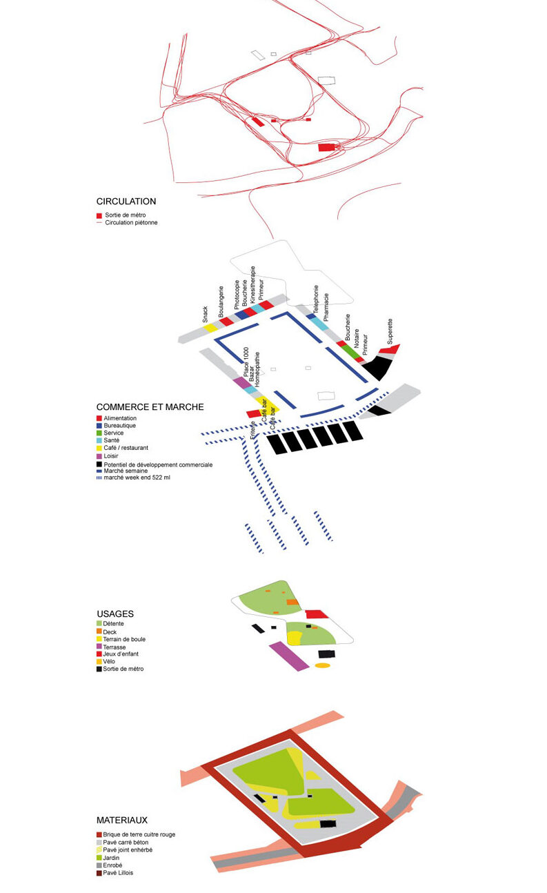 La requalification de la place Madeleine Caulier et de la place Eugène Jacquet est un sujet complexe. Plusieurs enjeux apparaissent : une place à vivre au quotidien, capable d’accueillir des moments chargés d’émotions. Pour envisager une évolution, l’occupation actuelle par le stationnement est à supprimer, une nouvelle sortie de métro est à intégrer.