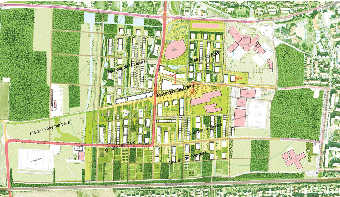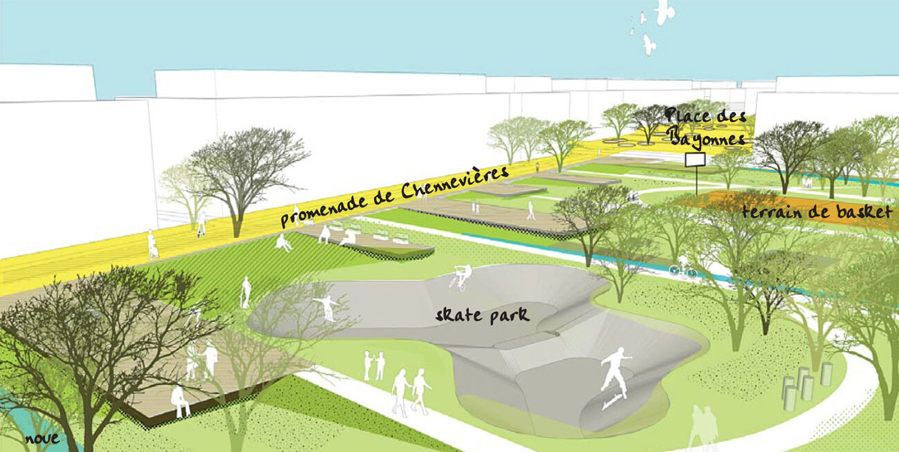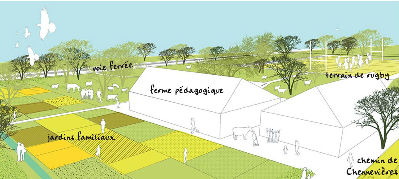 L’urbain va glisser dans le grand paysage, composé d’une trame agricole, d’horizons dégagés, de faibles pentes et de reliquats de boisements. C’est le chemin de Chennevières qui va venir articuler deux grands quartiers autour d’une grande place hybride, où se rencontrent agriculture urbaine et sports de glisse, ferme pédagogique et terrasses de cafés.