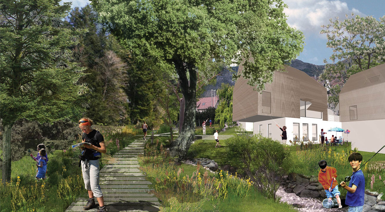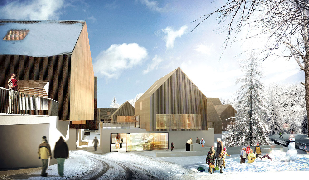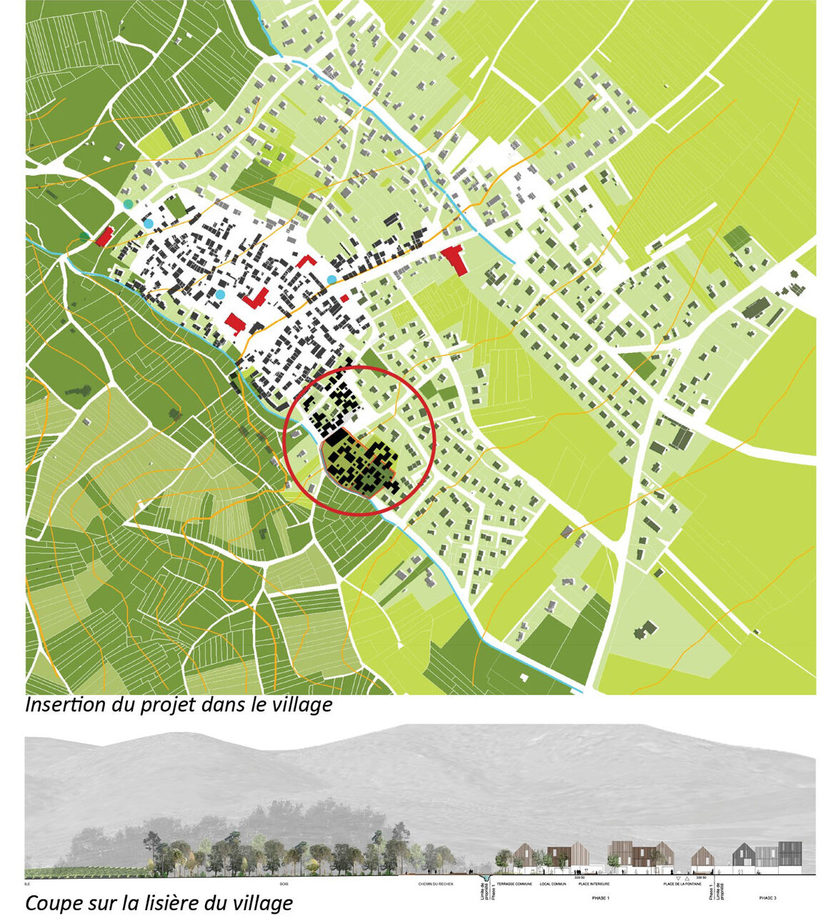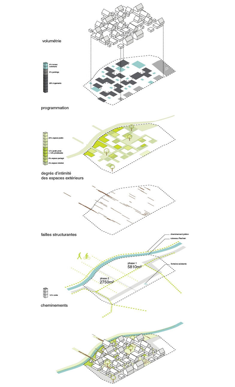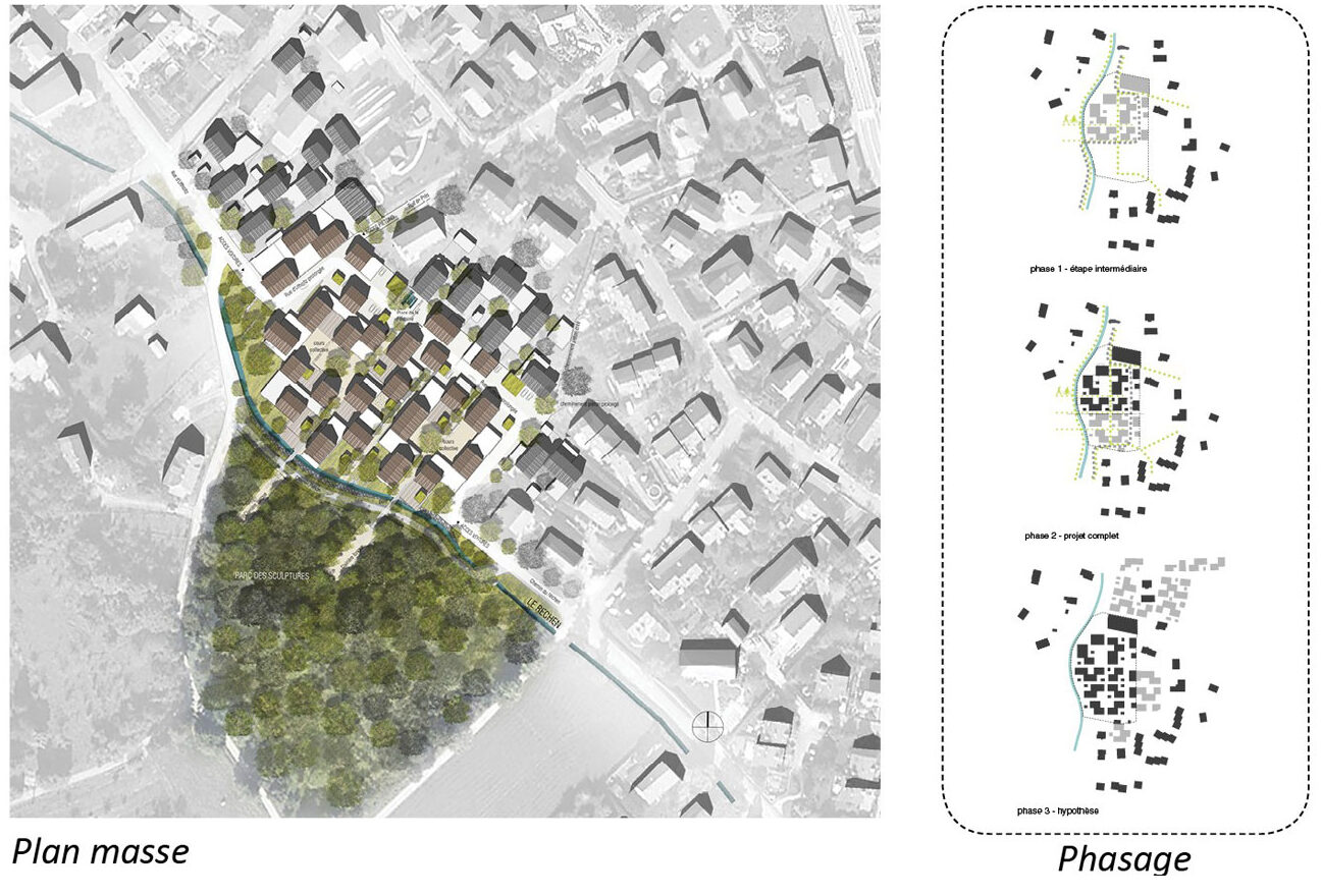 Notre projet innovant s’inspire avant tout du grand paysage car à Wattwiller, le paysage est celui qu’on regarde, qui se vit comme un spectacle grandiose face aux Ballons des Vosges. Il s’inspire également du cadre bâti existant, celui du village ancien avec sa densité, son architecture hybride en bois et aux toitures marquées. Enfin, il puise dans la structure des espaces publics existants, imbrication d’espaces de cours ouvertes sur rue et de sentes secrètes. Notre projet parle de face-à-face avec la nature, d’architecture vernaculaire contemporaine ordonnée et de cohabitation.