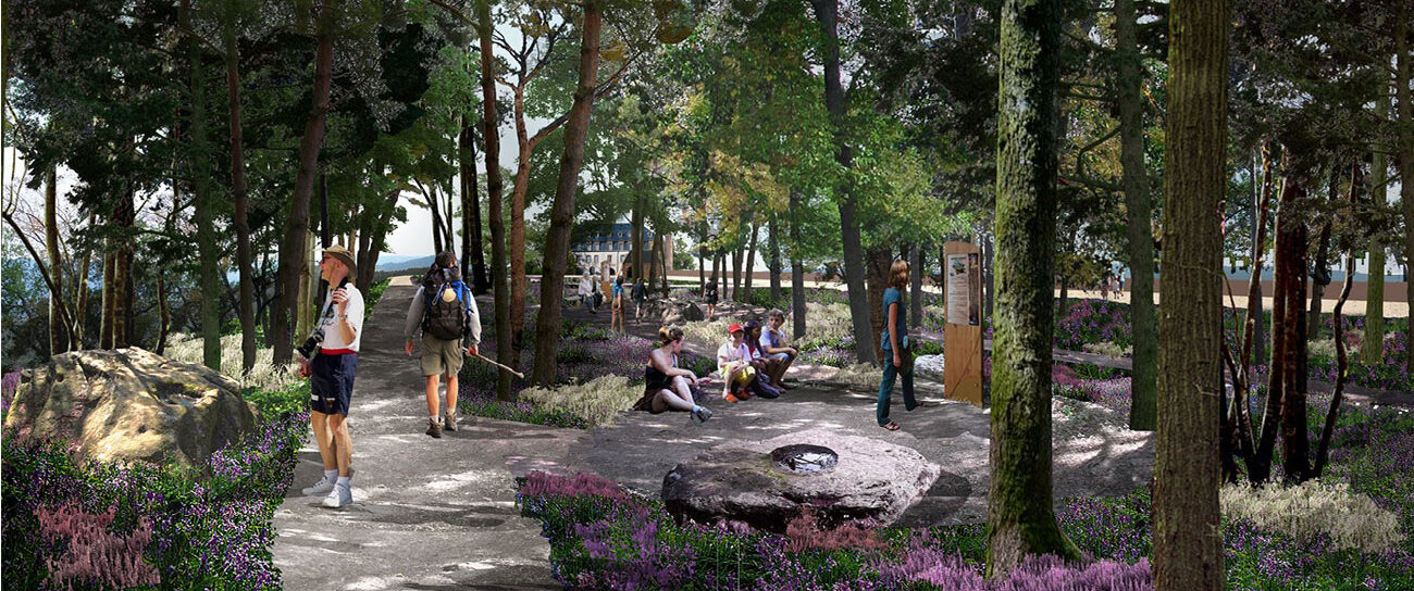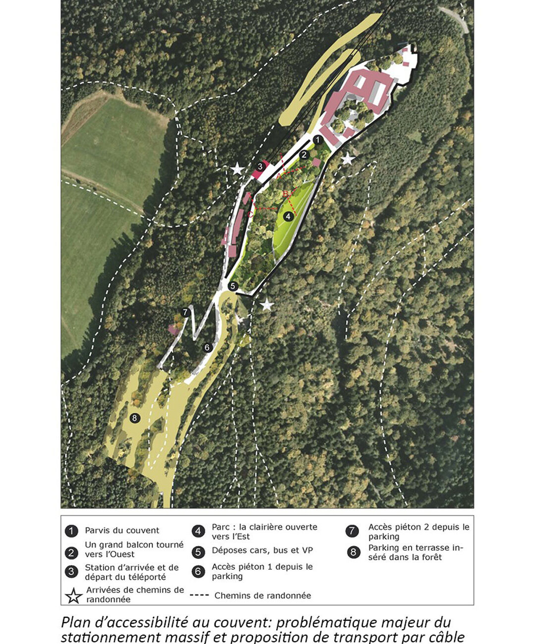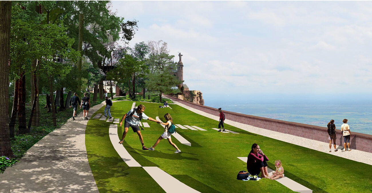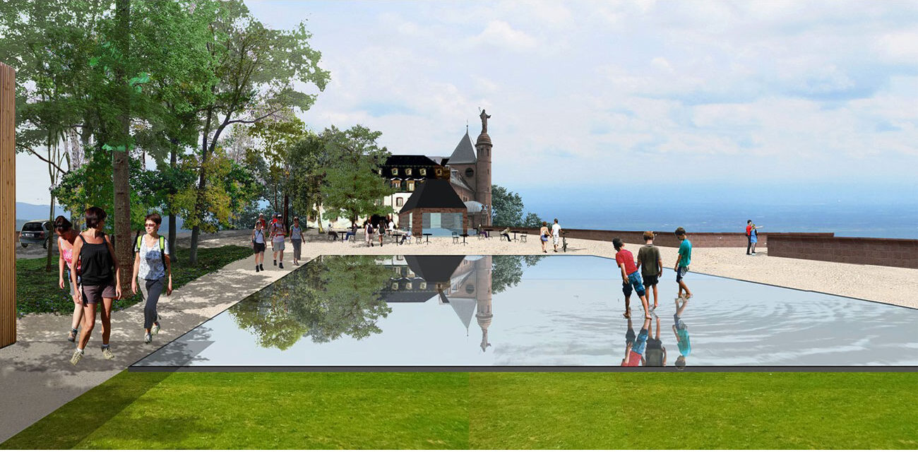 Au-delà de son attrait patrimonial et historique, le Mont Sainte-Odile est un site paysager exceptionnel. Après une ascension abrupte au milieu de cette ambiance forestière teintée de surnaturel, on atteint le sommet, plateau ouvert et incliné, qui amène lui-même au point culminant du lieu, le balcon au cœur du couvent. Nos propositions d’aménagement et d’accès à ce site protégé partagent le fait de respecter et de mettre en valeur toutes ses caractéristiques, pour imaginer un lieu mêlant plusieurs qualités et des publics différents. Celles d’un grand parc, placé au cœur du paysage vosgien, et celles d’un endroit chargé d’histoire et de spiritualité.