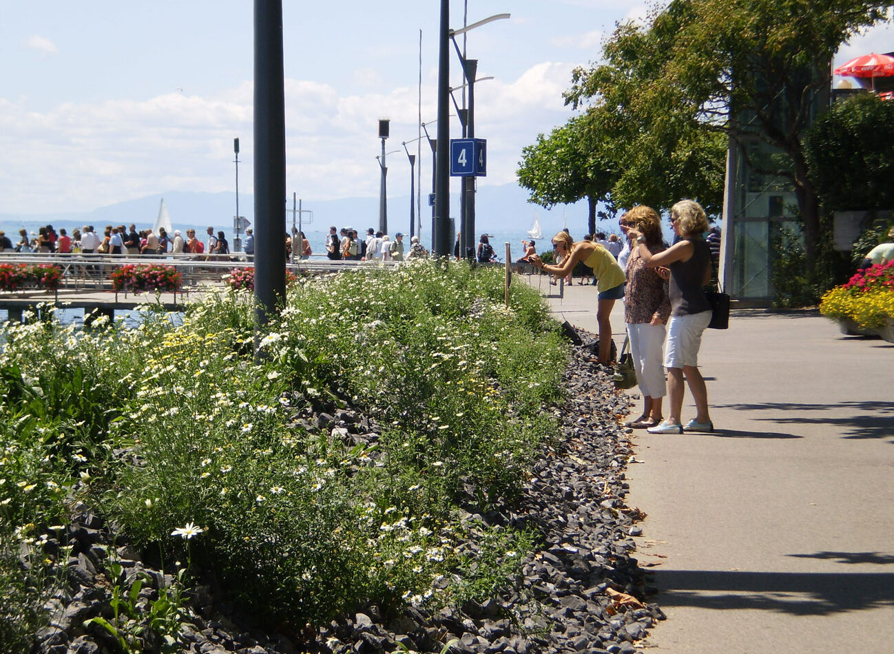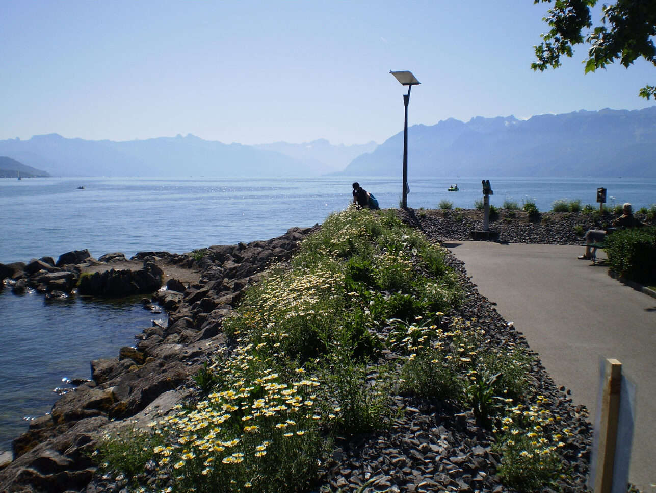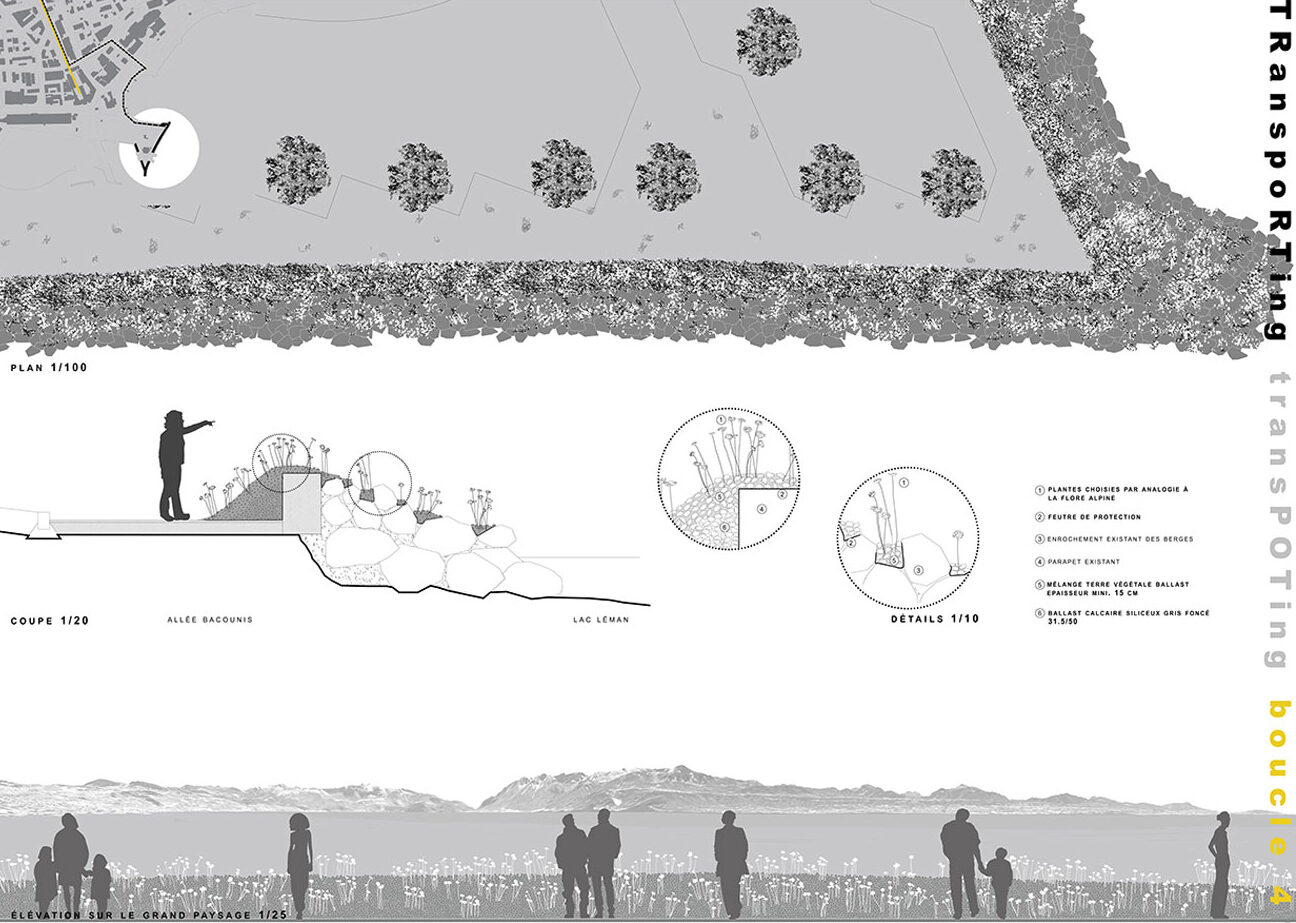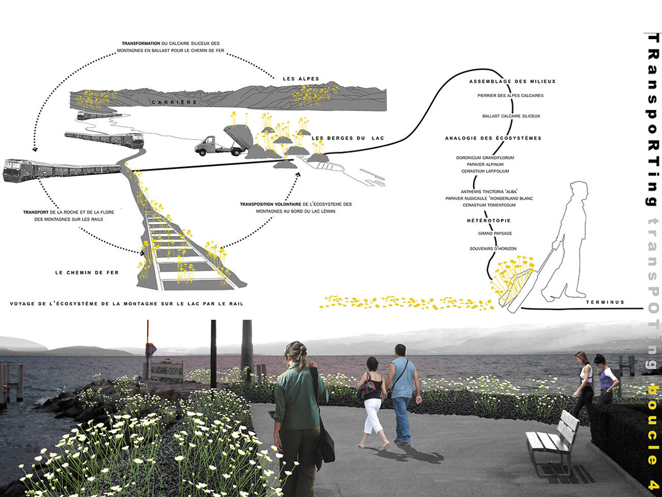 Le projet se pense comme une hétérotopie, comme « la localisation physique d’une utopie », comme un « espace concret qui héberge notre imaginaire de voyage ». Il met en forme le thème du voyage par des analogies, des assemblages, des transmutations de milieux et par le fil d’Ariane qu’est le rail. Le ballast a été choisi pour sa symbolique (voyage rail), par analogie (pierrier des Alpes), pour sa provenance (carrière face au site). Ce ballast s’épand sur le parapet existant et jusque dans les anfractuosités de l’enrochement existant des berges du lac Léman. Il est planté d’espèces choisies par analogie (traits anatomiques) à la végétation alpine.